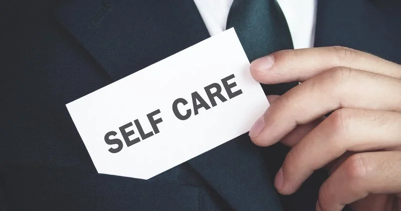A male wearing a suite is tucking a card labeled “self care” into his pocket.