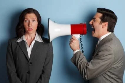 Two professionals, a male holding a bullhorn and screaming into it. A female at the end of the bullhorn has a look of overwhelm and fear on her face.